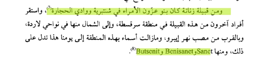 ▪︎و ايضا من استوطن الشمال الشىقي الاندلسي قبيلة زناتة العظيمة:"" ومن قبيلة زناتة كان بنو عزّون الأمراء في شنتبرية ووادي الحجارة، واستقر أفراد آخرون من هذه القبيلة في منطقة #سرقسطة، وإلى الشمال منها في نواحي لاردة وبالقرب من مصب نهر إيبرو، ومازالت أسماء بهذه المنطقة إلى يومنا هذا تدل على ذلك Butsenit, Benisanet و Sane""!!
