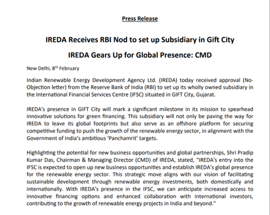 11/🌿 Big news for #IREDA! 🌍 RBI greenlights #ireda subsidiary in GIFT City, signaling global growth & India's sustainable commitment 🏢 Now IREDA can Finance RE projects in foreign currency, saving on forex hedging costs🌞💰 #RenewableEnergy #Sustainability #InvestInIREDA🇮🇳