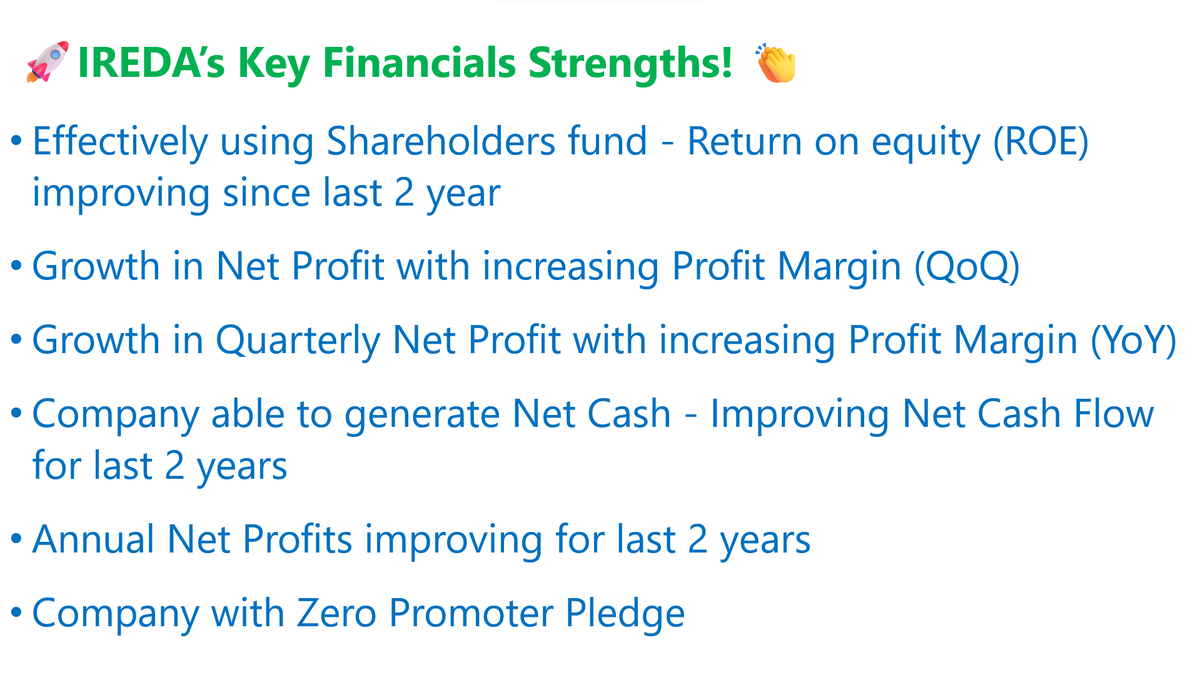 14/🚀 Impressive financial strengths at #IREDA! ROE improving, net profit & margin growing quarterly and annually, positive net cash flow for 2 years, and zero promoter pledge! Bullish for #IREDA💰📈 #InvestInIREDA🇮🇳#RenewableEnergy