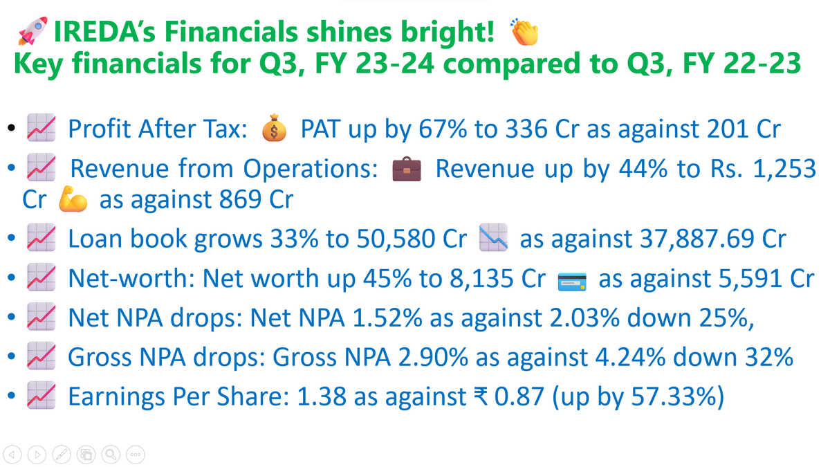 16/📈#IREDA's financials shine bright in Q3 FY 23-24! 💼 PAT up 67% to ₹336 Cr, Revenue up 44% to ₹1,253 Cr, Loan book grows 33% to ₹50,580 Cr, Net worth up 45% to ₹8,135 Cr. Net NPA drops 25%, Gross NPA drops 32%. Earnings Per Share up 57.33% to ₹1.38! 💰👏#InvestInIREDA🇮🇳