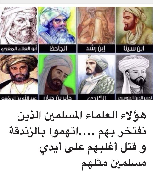 " العلماء الذي تفتخرون بهم تم تكفيرهم وقتلهم ، فكيف تفتخرون بمن كفرتوهم وقتلتوهم ؟ فالحضارة الا سلامية ليس لها اي وجود !!!