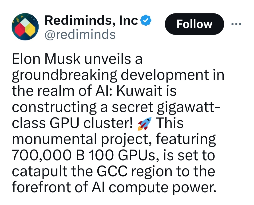 انها دولة #الكويت التي تبني مجموعة GPU سرية من فئة غيغاوات. ويهدف هذا المشروع الضخم، الذي يضم 700000 وحدة معالجة رسوميات B 100، إلى دفع منطقة دول مجلس #التعاون_الخليجي إلى طليعة قوة الحوسبة في مجال الذكاء الاصطناعي.