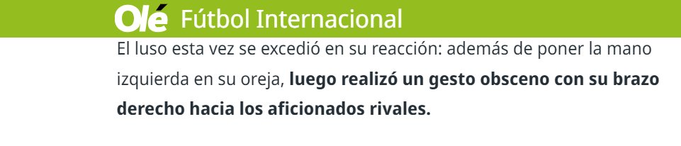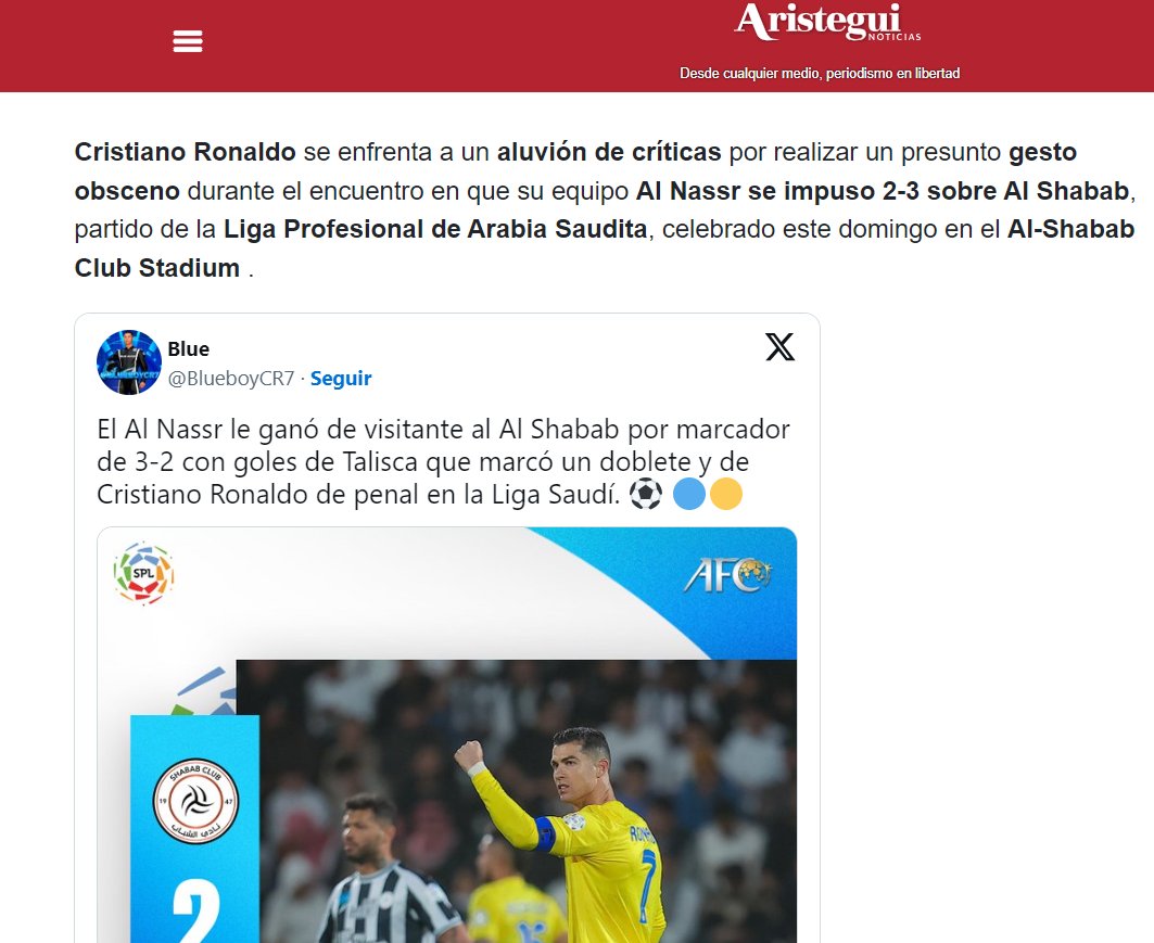 🚨🚨موقع "aristeguinoticias" المكسيكي: "الانتقادات تنهال على كريستيانو بسبب لفتة بذيئة.. عبثت جماهير #الشباب مع قائد #النصر، بمضايقته بالصراخ "ميسي ميسي..."، ورد النجم البرتغالي بحركة نابية، بعد فوز فريقه 3-2.. أظهرت مقاطع فيديو على وسائل التواصل الاجتماعي #رونالدو وهو يضع يده على أذنه وكأنه يستمع قبل أن يحرك يده بشكل متكرر للأمام، أمام منطقة الحوض.. بعض الخبراء السعوديين قالوا إنه يجب معاقبة رونالدو.. واجه رونالدو انتقادات مماثلة من قبل، وفي أبريل من العام الماضي، ظهر وهو يمسك بأعضائه التناسلية أثناء سيره على مقاعد البدلاء بعد نهاية مباراة الدوري أمام الهلال، والتي خسرها النصر 2-0.. كذلك هذا الشهر، التقط شال #الهلال الذي أُلقي عليه من المدرجات، ووضعه في سرواله الداخلي ثم رماه بعيدًا أثناء توجهه إلى نفق غرفة خلع الملابس بعد خسارة النصر 2-0 في نهائي كأس موسم الرياض".