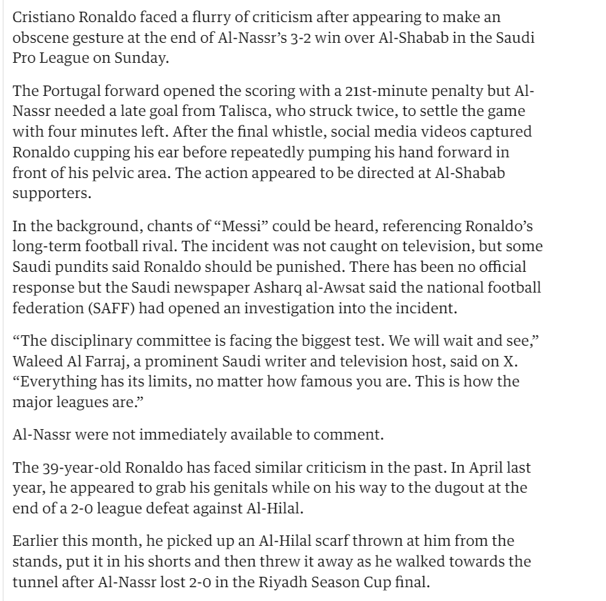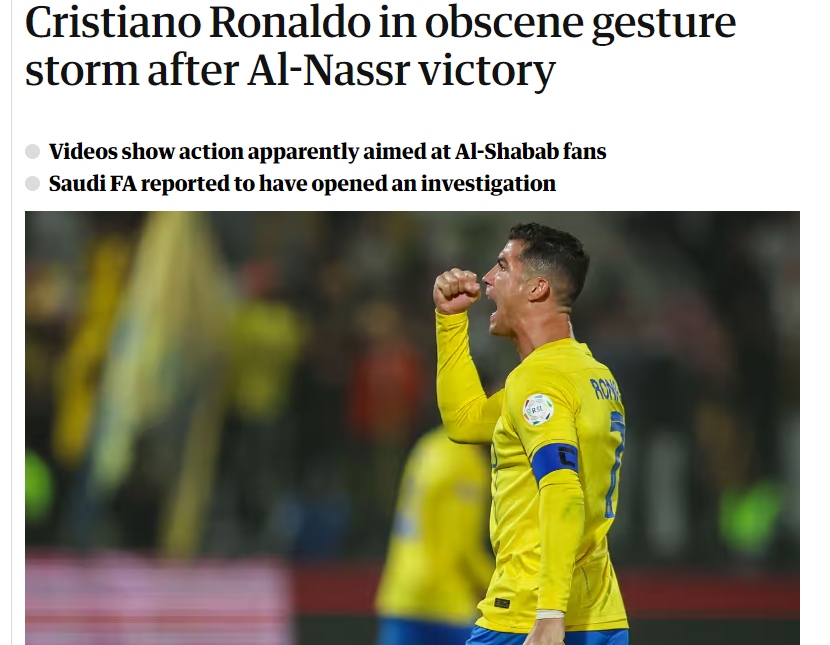 🚨🚨صحيفة "الغارديان" البريطانية: "#رونالدو يقوم لفتة فاحشة عاصفة بعد فوز #النصر تجاع مشجعي #الشباب، ويُقال أن الاتحاد السعودي لكرة القدم فتح تحقيقًا.. واجه كريستيانو موجة من الانتقادات بعد أن قام بلفتة بذيئة في نهاية فوز النصر 3-2 على الشباب.. في وقت سابق من هذا الشهر، التقط اللاعب شال #الهلال الذي أُلقي عليه من المدرجات، ووضعه في سرواله ثم رماه بعيدًا أثناء سيره نحو بعد خسارة النصر 2-0 في نهائي كأس موسم الرياض".