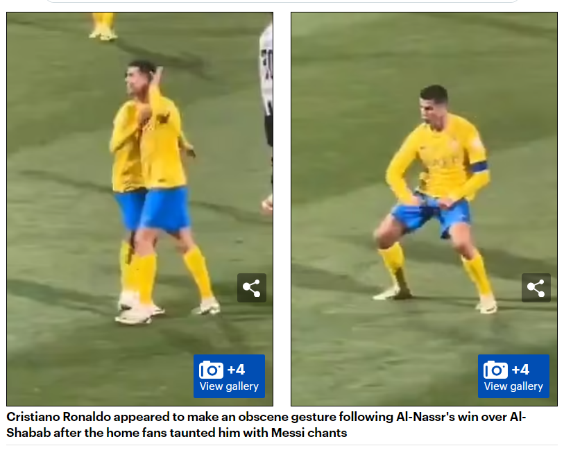 🚨🚨صحيفة "ديلي ميل" الإنجليزية: "#رونالدو يقوم بإيماءة بذيئة تجاه المشجعين بعد أن هتفوا "ميسي، ميسي" في وجهه عقب فوز #النصر على #الشباب، ويمكن أن يُجري تحقيقًا من الاتحاد السعودي لكرة القدم.. بدا أن كريستيانو قام بحركة نابية بعد أن سخرت منه جماهير الفريق بهتافات ميسي، رداً على ذلك، وضع رونالدو يده على أذنه قبل أن يقوم بلفتة تجاه عضوه التناسلي، ويبدو أن الإشارة كانت موجهة إلى المشجعين الحاضرين".