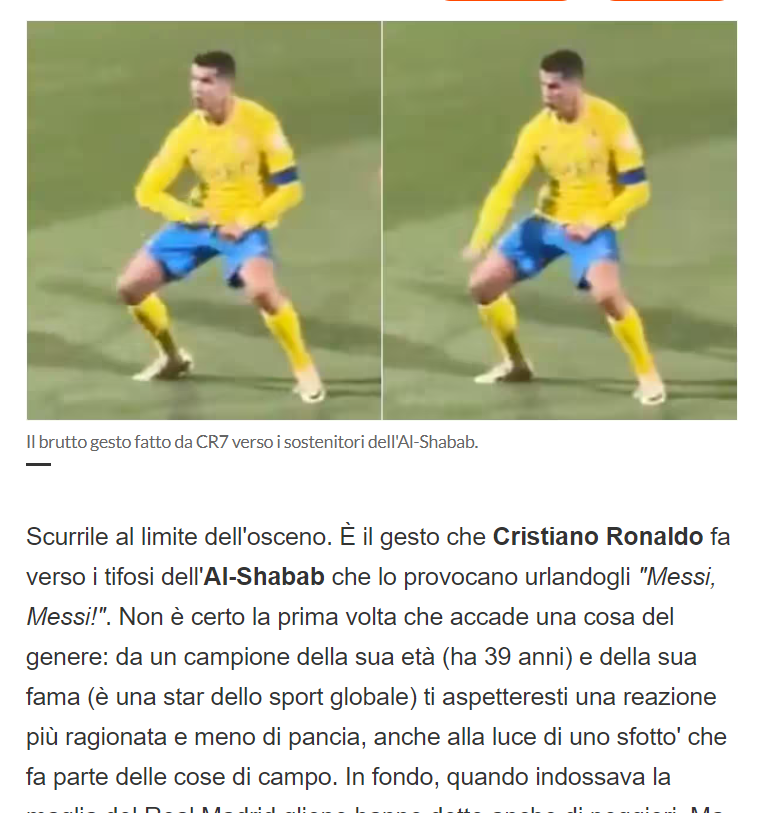🚨🚨صحيفة "كوريري ديلي سبورت" الإيطالية: "الجماهير تهتف #ميسي، وكريستيانو #رونالدو يرد بلفتة بذيئة.. كان النجم البرتغالي هو بطل لفتة مثيرة بعد فوز #النصر على #الشباب بنتيجة 3-2، في الجولة الـ21 من الدوري السعودي.. هتفت جماهير الشباب مراراً وتكراراً لـ ميسي، مما استفز لاعب يوفنتوس السابق. ورد رونالدو بوضع يديه أولا على أذنيه ثم بحركة استفزازية ومبتذلة، الأمر الذي أثار المزيد من ردود الفعل من جانب الجماهير".