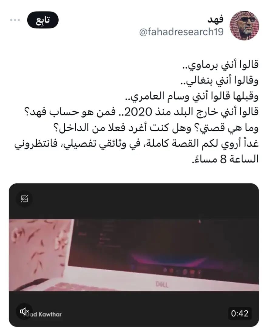 يدّعي أنه هو اللي كان يدير حساب فهد الغفيلي من الداخل ويحمي نفسه بالVPN وهنا نفترض أنه شخص جيد تقنيًا لكنه في الوقت نفسه ناسي يقفل صفحاته الشخصية بالفيس بوك وغيره واللي بعضها كانت لبيع الأدوات الجنسية … يتبع