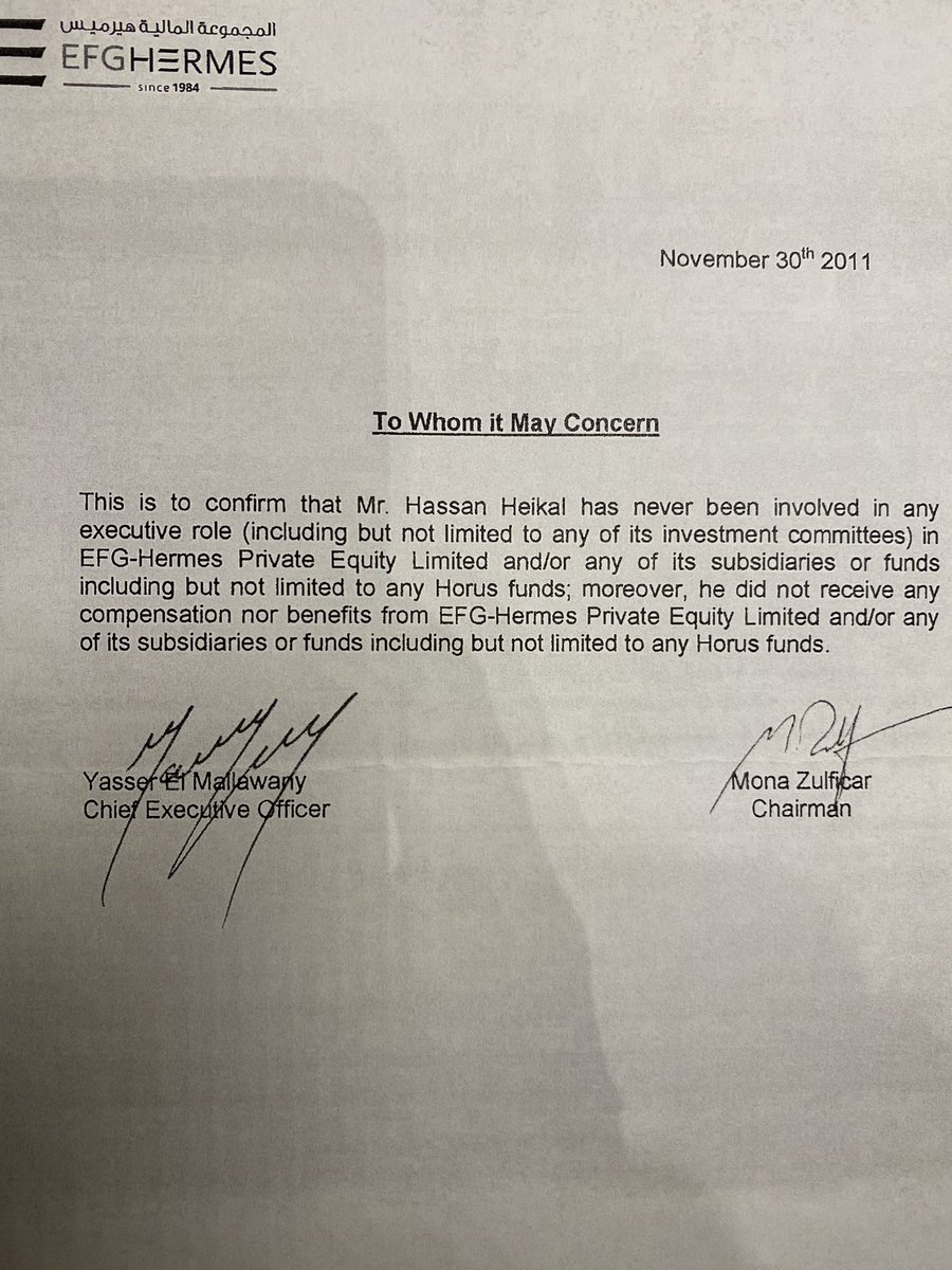 مارس ٢٠١١، في مكتبي في القرية الذكية، عندما تلقيت اتصالاً من النيابة للمثول أمامها للاستجواب على سبيل الاستدلال في علاقة علاء وجمال بالمجموعة المالية. لمدة ٥ ساعات قلت انه ولا أنا ولا الشركة أخدنا حاجة من الدولة، ولا عقد غاز ولا شركة خصخصة، ولا تعاملنا على ديون مصر، وانه لا علاقة لنا بثروة مبارك وعائلته خارج مصر. طلب مني ان أعود الأسبوع التالي بجميع المستندات وقد قمت بذلك. بعد عدة اسابيع من الفحص لجميع الشركات داخل وخارج مصر عاد ليقول لفظا انه مفيش حاجة عليكم.