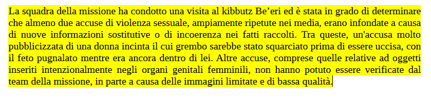 Le prove del 4 marzo mattina (web.archive.org) diventano "motivi per credere" nel pomeriggio (#a-un-team-reported-on-evidence-to-support-multiple-claims-of-sexual-assault-on-oct-7" target="_blank" rel="noopener" onclick="event.stopPropagation()">web.archive.org)