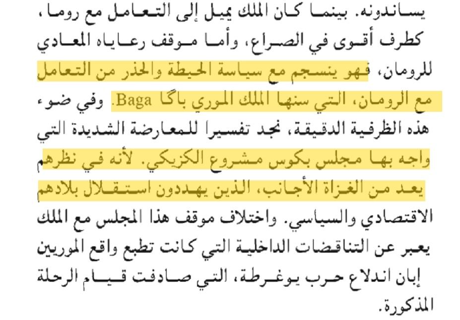 ▪︎ نقرأ جيدا :"" أما زمن الرحلة فقد صادف ظرفا دقيقا بالنسبة لواقع المملكة المورية تحت حكم بكوس الأول، حيث انطلق العدوان الروماني على يوغرطة، الذي كان من رعايا الملك الموري يساندونه بينما كان الملك يميل إلى التعامل مع روما ، كطرف أقوى في الصراع، وأما موقف رعاياه المعادي للرومان، فهو ينسجم مع سياسة الحيطة والحذر من التعامل مع الرومان التي سنها الملك الموري باگا Baga. وفي ضوء هذه الظرفية الدقيقة، نجد تفسيرا للمعارضة الشديدة التي واجه بها #مجلس بكوس #مشروع_الكزيكي. لأنه في نظرهم يعد من #الغزاة الأجانب الذين يهددون استقلال بلادهم الاقتصادي والسياسي. واختلاف موقف هذا المجلس مع الملك يعبر عن التناقضات الداخلية التي كانت تطبع واقع الموريين إبان اندلاع حرب يوغرطة، التي صادفت قيام الرحلة المذكورة""!