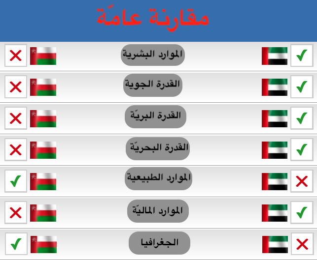خلال كم دقيقة تستطيع الإمارات تدمير القواعد العسكريّة للجيش السلطاني، مع تدمير محطات التحلية وإنتاج الكهرباء ومصافي النفط وشلّ المواصلات والإتصالات في سلطنة #عُمان في سيناريو حرب معزولة بين الطرفين؟