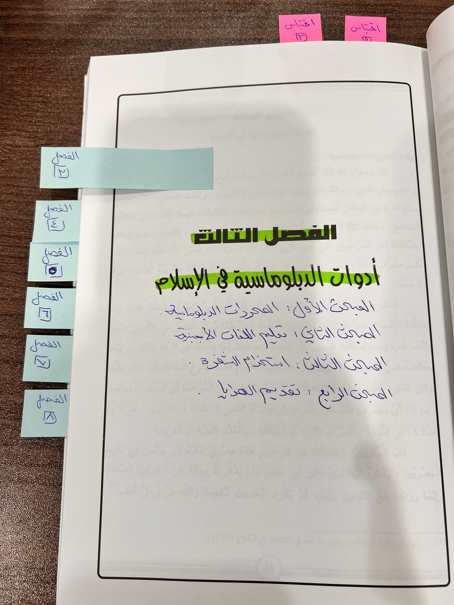 الفصل الأول: أسس الدبلوماسية في الإسلام، حيث تفرع الفصل إلى ٣ مباحث هي كالآتي: