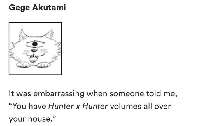 ذكر جيجي، مؤلف جوجوتسو، أنه تم أحراجه عندما قال أحدهم بدهشة: "لديك مجلدات هنتر في كل أنحاء منزلك!"