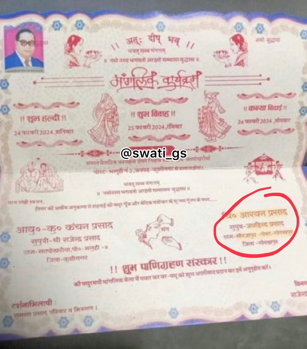 See this wedding card. Groom’s name is mentioned as ‘Aryan Prasad, son of Jaihind Prasad’. On the wedding day, none from his family or relatives turned up
