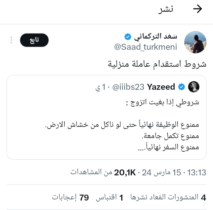 لكن في نفس الوقع يستسيغ نفس الشروط ويلمح بأنها مقبولة ومفهومة بالكامل اذا كان في اطار الوظيفة وكانت نفس هذي المرأة خادمة وشغالة فأنظر يرعاك الله كيف يكون الكيل بمكيالين عند هؤلاء الطلية