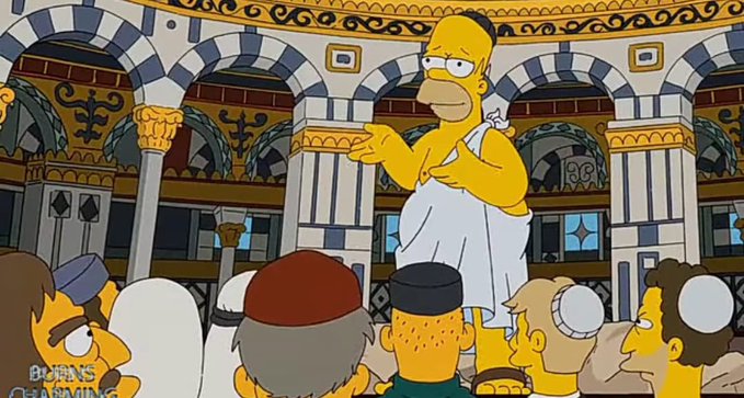 هنا هومر توجه للمسجد وكان يلبس لباسا يشبه للباس الاحرام وطاقية اليهود وبدأ في وعظ الناس ... هنا العالم كله عارض الحلقة لأنها تدعو لفكرة ماسونية وهي توحيد الاديان وهذا شيء غير مقبول على الاطلاق .. وهو من الامور التي تنادي بها الماسونية والتي هدفها هو القضاء على الاسلام ونشر دين جديد بمبادئ شيطانية .. وخلال تجوال عائلة سيمبسون في القدس كان معهم دليل سياحي والذي اخبرهم ان اي معلومة تأتيهم من غير اليهود هي معلومة خاطئة، وهنا نفهم ان ما حدث في المسلسل سابقا قبل 20 سنة نراه اليوم فإسرائيل كذلك ترفض اي معلومات صادرة عن الفلسطينيين او الدول المجاورة وتعتبر دائما ان روايتها هي الصحيحة ..