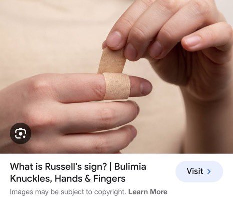 هذه العلامة تدل ان الشخص يستخدم يده للقيء المتعمد و غالبا ما يحدث هذا مع مرض النهام العصبي طبعا الاميرة ديانا ذكرت في اللقاء كذلك انها كانت تتقيء عمدًا و كانت تضع لاصق الجروح على يدها وكذلك ظهرت الاميرة كيت عدة مرات وهي تضع لصقة الجروح بيدها بالرغم من عدم اعلان العائلة انها تعاني من النهام