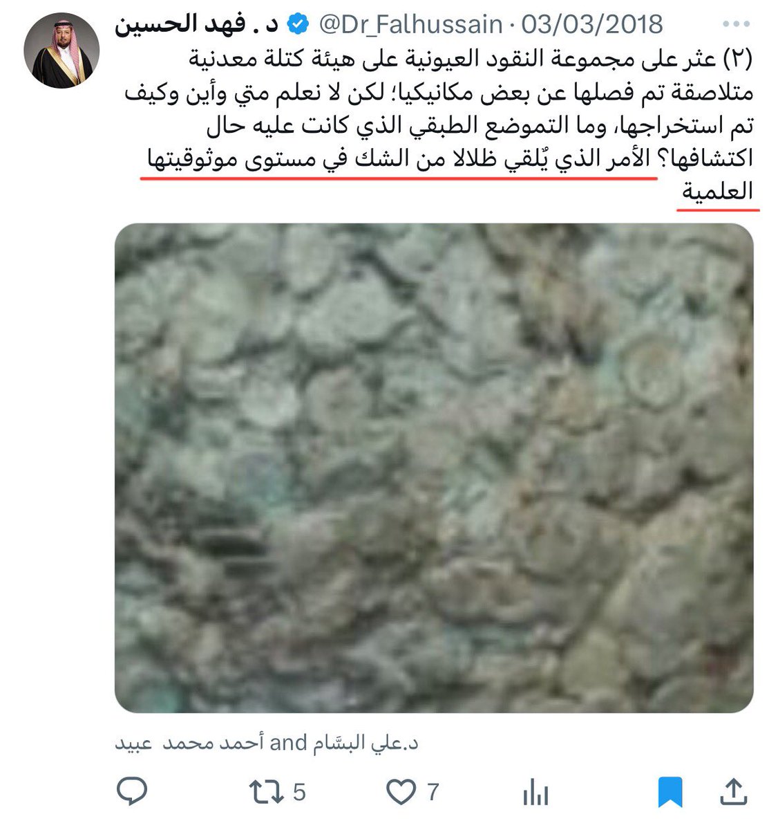 @Dr_Falhussain 1 - عدم معرفة كيفية استخراجها ومتى تم ذلك يشكك في الموثوقية العلمية لإدعاء أن العملة تعود للعيونيين
