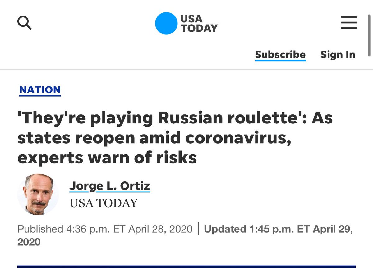 @USATODAY kept with the deadly theme, calling reopenings “Russian roulette.”