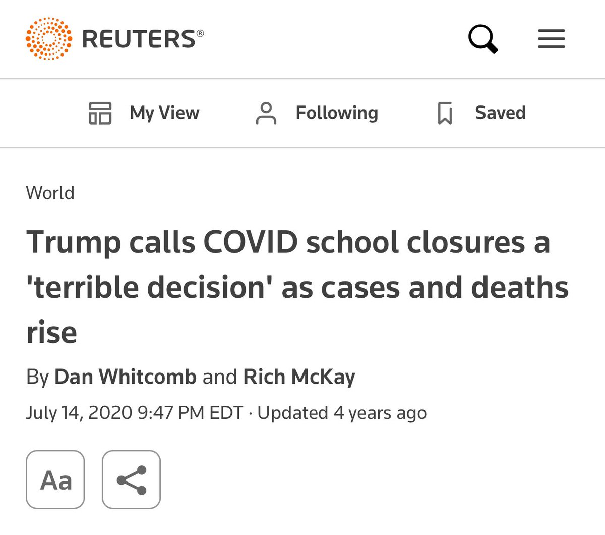 @Reuters made sure to include the case counts as a counter to Trump in the headline. How they wanted their readers to feel about his comments is clear.