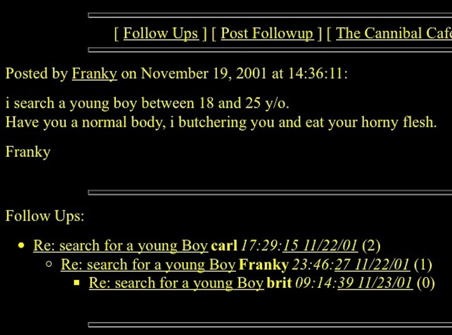 ارمين وهو في المتوسط بدأ معه موضوع الهوس بأكل اصدقائه في الفصل وتطور معه الموضوع لين قدر يحققه بعد 40 سنة