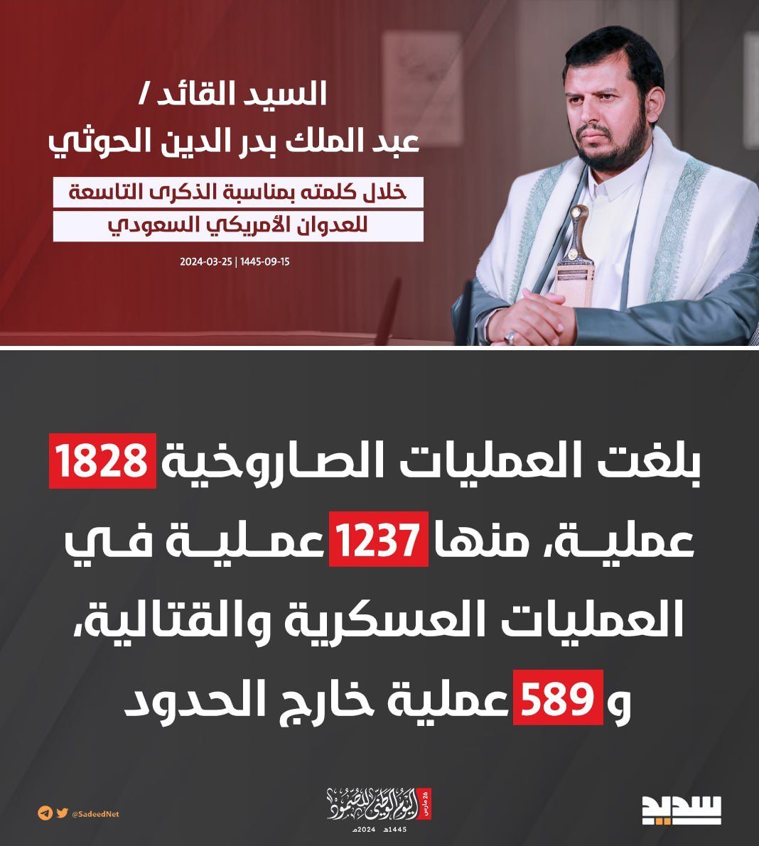 بلغت العمليات الصاروخية 1828 عملية، منها 1237 عملية في العمليات العسكرية والقتالية، و589 عملية خارج الحدود
