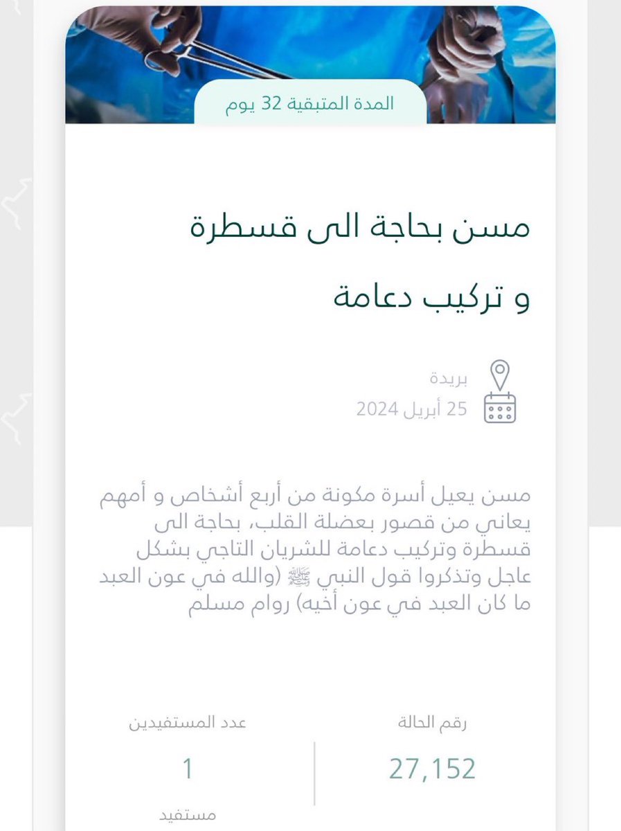 مسن يعاني من قصور بعضلة القلب وبحاجة الى قسطرة وتركيب دعامة للشريان التاجي ، وتذكروا قول النبي ﷺ (والله في عون العبد ما كان العبد في عون أخيه) رواه مسلم