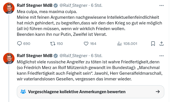 Und warum hätte Willy nicht verhandelt? Weil Putin ein Faschist ist, und das hätte Willy genauso gewusst wie du Genosse Stegner, mit den Sowjetgranden konnte er verhandeln, weil er sie einschätzen konnte, mit dem Faschisten Putin hätte er es nicht gemacht.