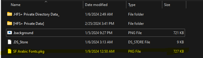 وبعدين هيفتحلك الفولدر تفتحة لحد ما تلاقي اسم الفونت .pkg تفكة بنفس الطريقة بردوا.