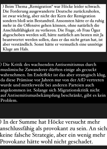 Genau deshalb konnte auch #Höcke nicht überzeugen. Er schlingerte zwischen seiner ideologischen Überzeugung und der Strategie der Selbstverharmlosung auf der Suche nach Anschluss.