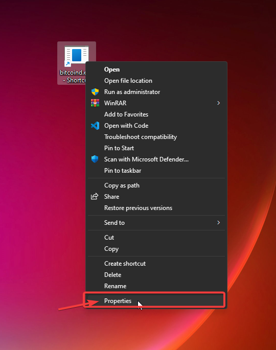- اضغط نقرة يمين بزر الفأره على ملف Bitcoind.exe مثل ما موضح بالصورة