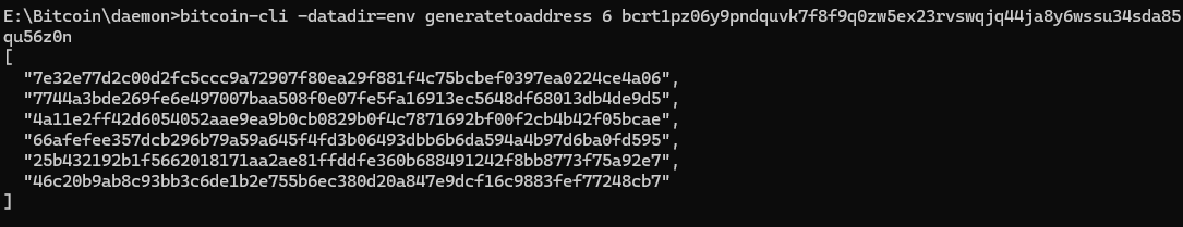 bitcoin-cli -datadir=env generatetoaddress 1 <ADDRESS>