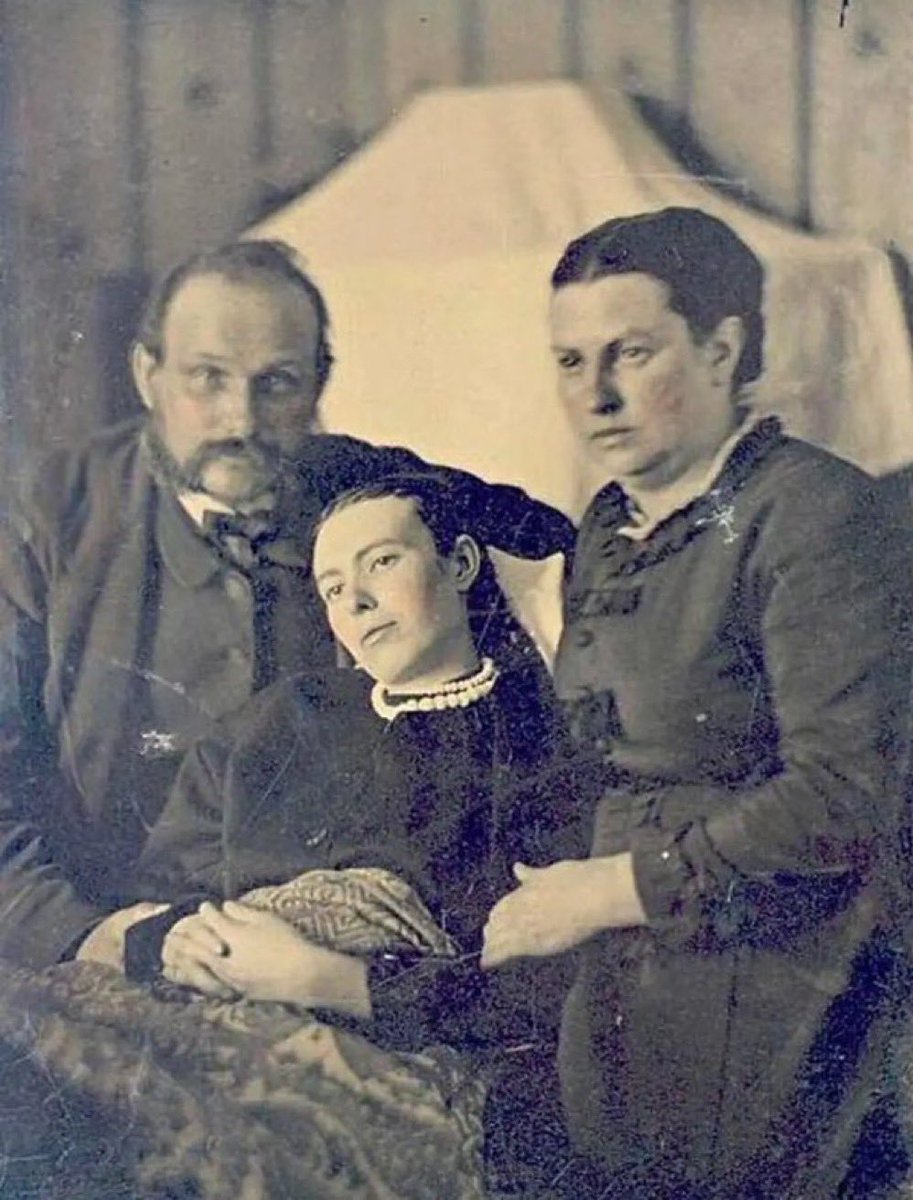 أم وأب يلتقطان صورة مع ابنتهم المتوفاه كان هذا الامر شائعا في انجلترا التصوير مع الموتى .