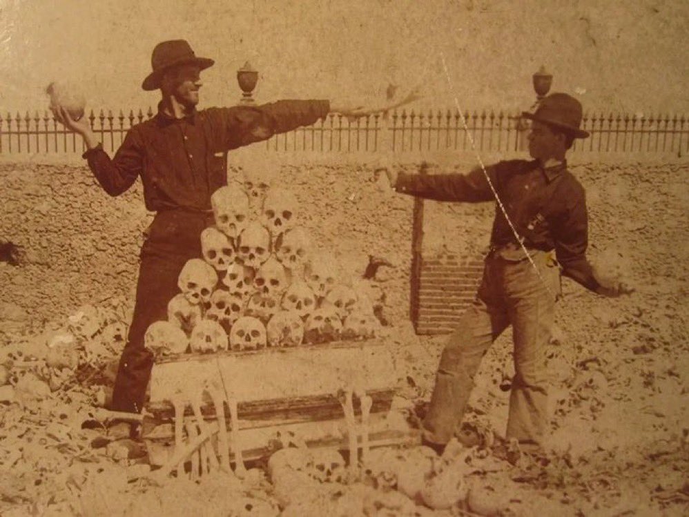 مقبرة هافانا مليئة بالهياكل العظمية حيث انه بعد ٥ سنوات اذا لم يدفعوا مبلغ لقبور موتاهم تنبش القبور وترمى في مكان مخصص لها وفي هذه الصورة: للجنود الأمريكيين يلعبون في 💀