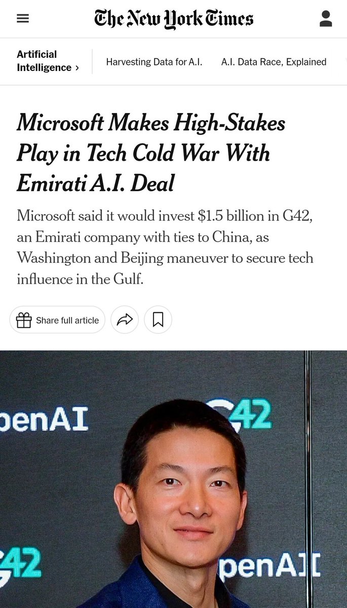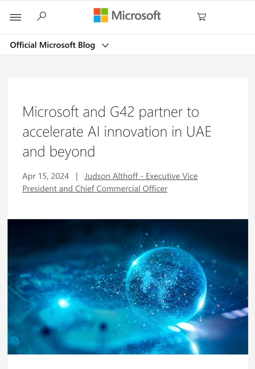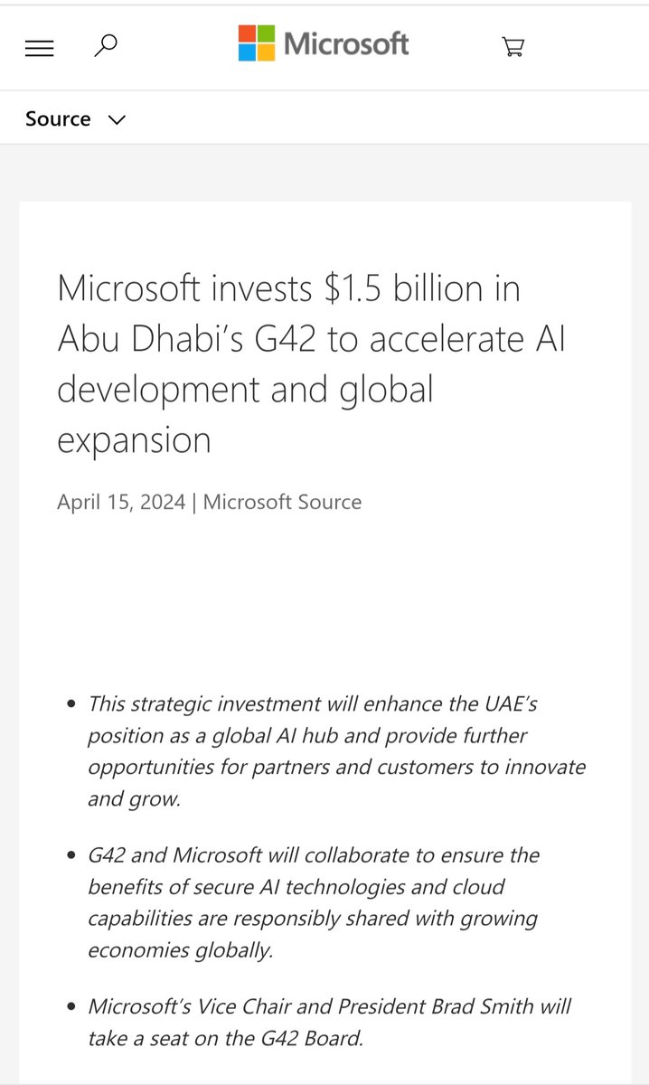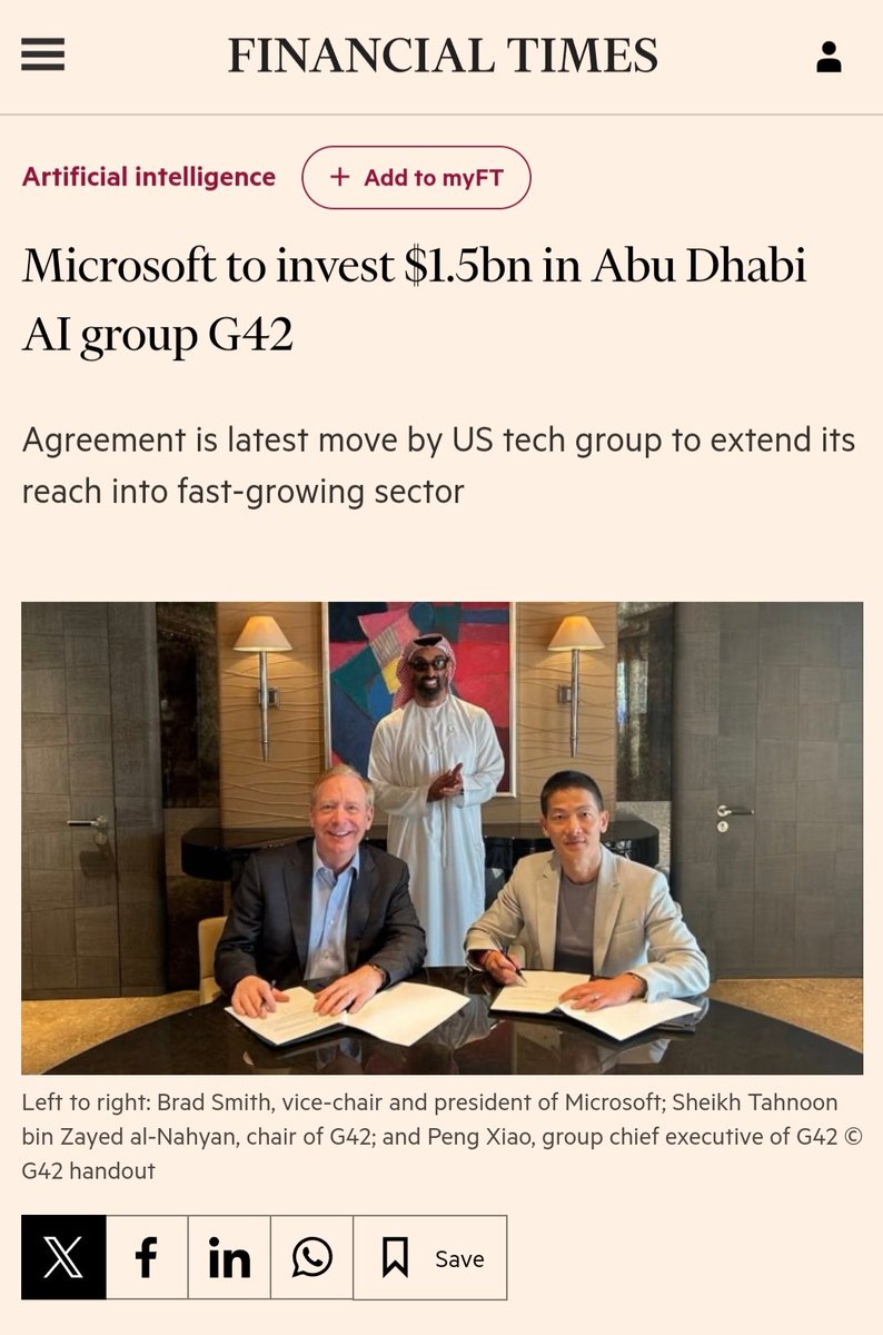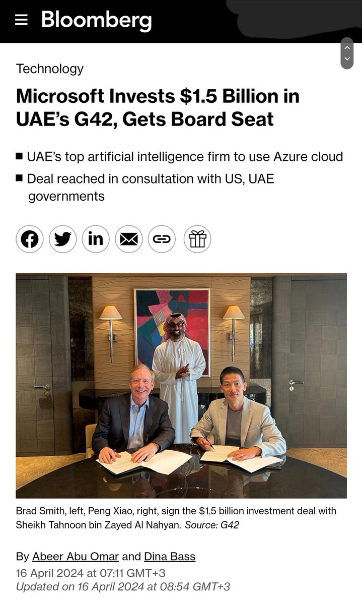 شركة #مايكروسوفت تستثمر 1.5 مليار دولار في شركة #G42 الاماراتية في #أبوظبي لتسريع تطوير #الذكاء_الاصطناعي والتوسّع العالمي.