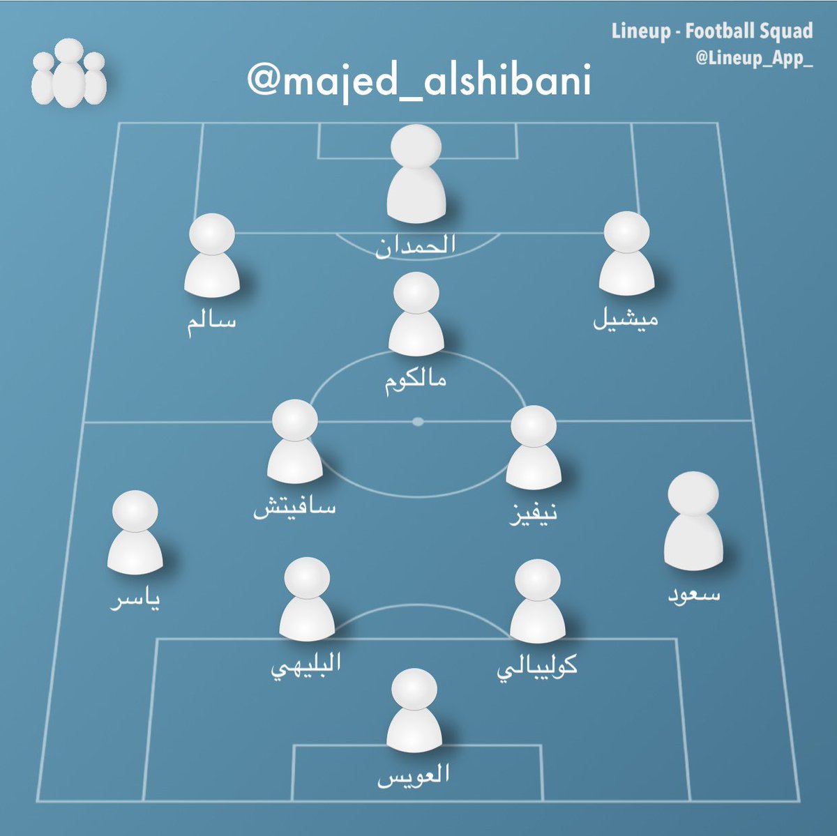 أخيرًا أعتقد هذا أنسب تشكيل للإياب ، مباراة محتاجة أولا تجنب الشحن من الجماهير والإعلام والعبارات الرنانة ، أنت أفضل من خصمك وعشان تهزمه ما تحتاج أكثر من لعب مباراة طبيعية وفقًا لمستواك وتجنب الأخطاء الفردية السهلة اللي صارت في الذهاب.