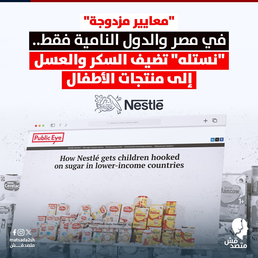 📌 كشف تحقيق استقصائي، أجرته منظمة التحقيق "Public Eye" السويسرية بالتعاون مع شبكة العمل الدولية لأغذية الأطفال (IBFAN)، عن قيام #شركة_نستله للصناعات الغذائية بإضافة السكر والعسل إلى حليب الأطفال (نيدو) ومنتجات الحبوب (سيريلاك) التي تبيعها في دول في #أفريقيا و #آسيا و #أمريكا_اللاتينية، في حين أن هذه المنتجات خالية من السكر في بلدها الأصلي #سويسرا وفي الأسواق الأوروبية الرئيسية.