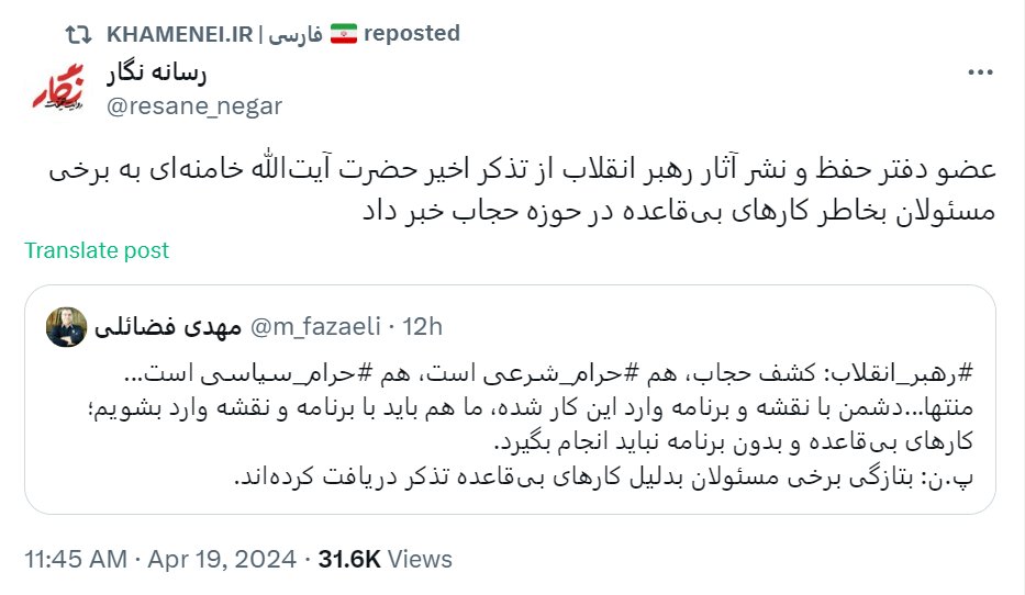 اکنون فضائلی، طوری قلمفرسایی کرده که از آن برداشت شود، رهبری به طرح نور، معترض است⬇️