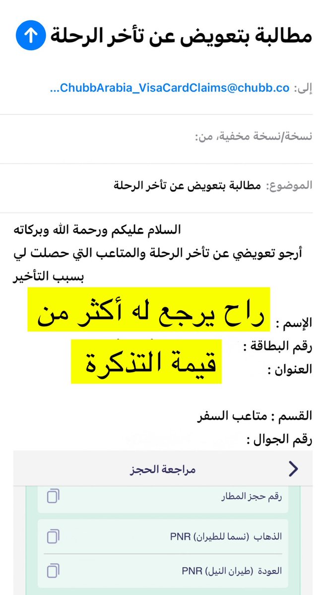 دخل على الرابط ؛ وعرف إن بطاقته البلاتينية من أحد البنوك فيها تأمين سفر ويحق له رفع مطالبة ✅ وبالفعل قام برفع مطالبة عن طريق الإيميل والخطوات سهلة جدا