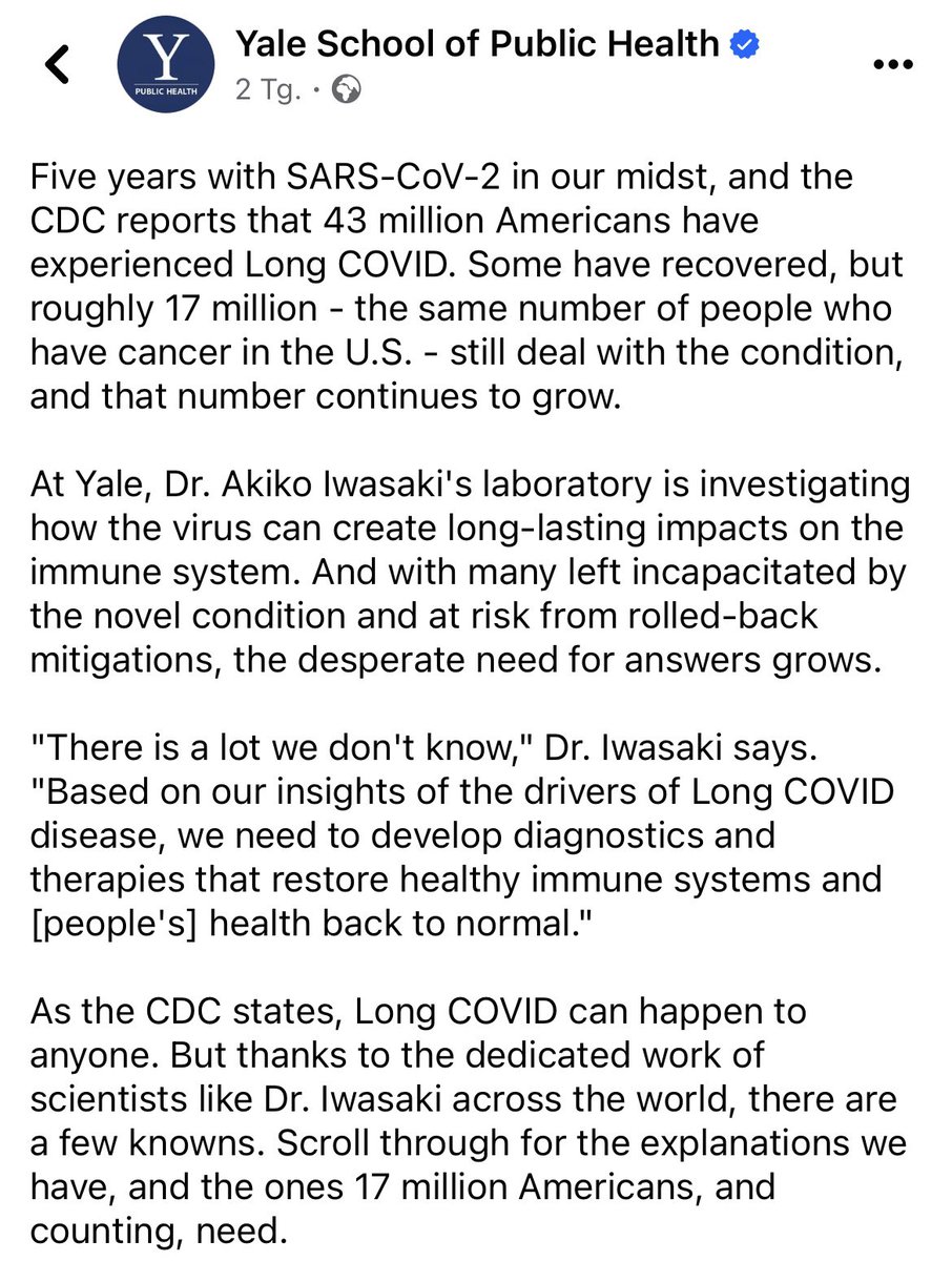 „Fünf Jahre mit #SARSCoV2 in unserer Mitte, und die CDC hat berichtet, dass 43 Millionen Amerikaner an #LongCovid erkrankt sind...