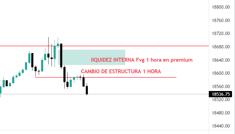 Ejemplo (#NQ). Toma de liquidez externa (diario)en los últimos máximos históricos. Debemos marcar la liquidez interna en descuento (diario), en este caso un FVG