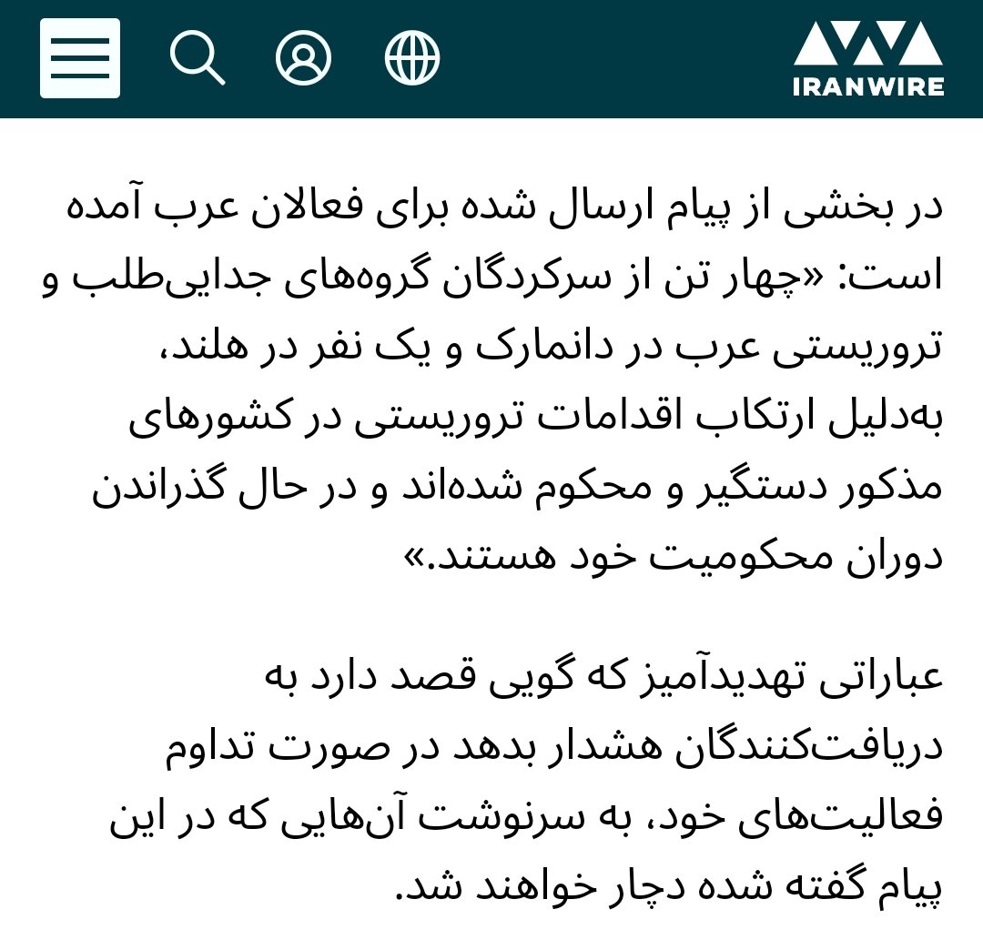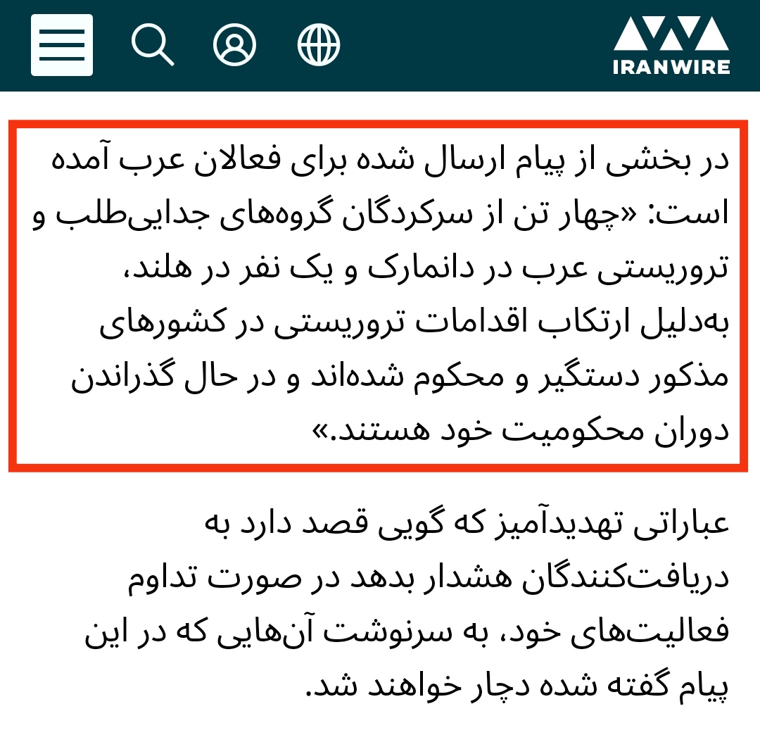 اما وقتی به متن خبر و ادعای خود این پان عرب ها مراجعه میکنیم میبینیم توش از تهدید جانی خبری نیست فقط توش خبر محکوم شدن ۴ پان عرب در دانمارک و هلند اومده اما #بایکوت_اینترنشنال صرفا تیتر خبر رو از قول شیما سیلاوی گفته بدون توضیحات