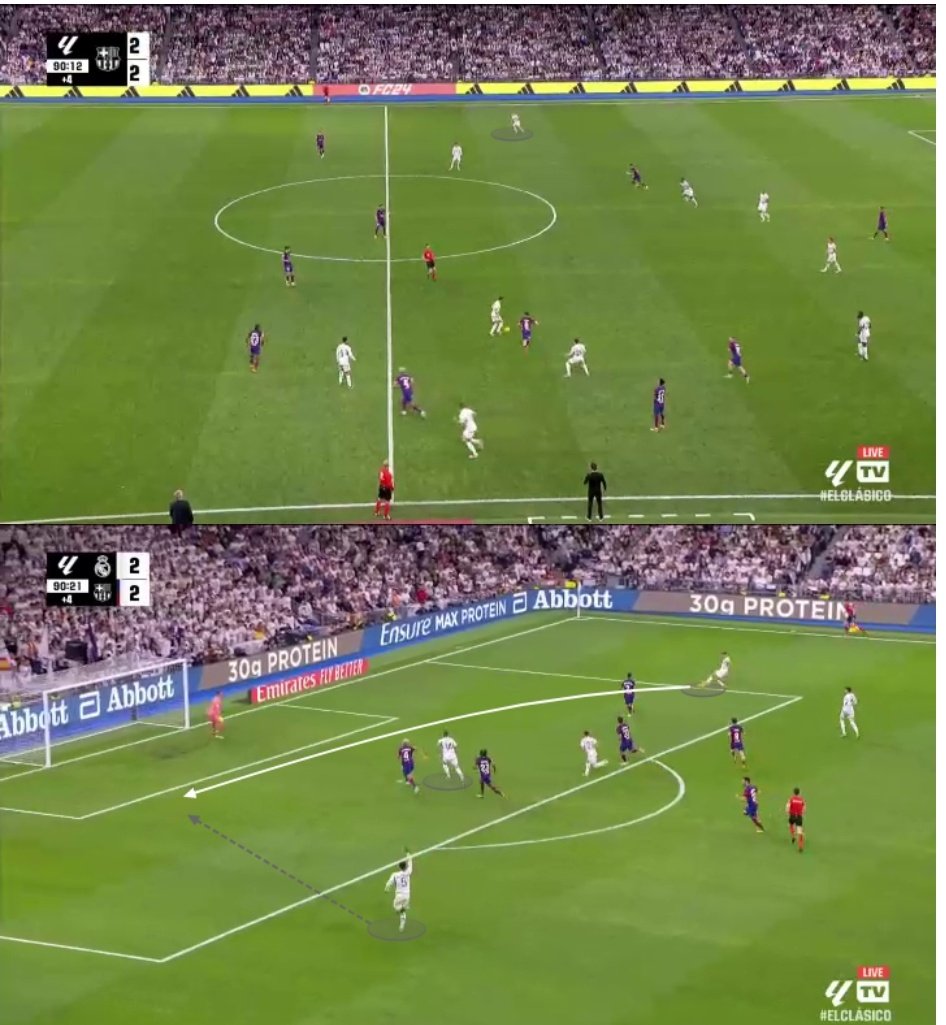 أمام برشلونة، بسبب الإصابات جزئياً، دفع أنشيلوتي بدفاع يضم ثلاثة لاعبين في خط الوسط: إلى جانب قلب الدفاع روديجر كان هناك كامافينجا، تشواميني وفاسكيز.