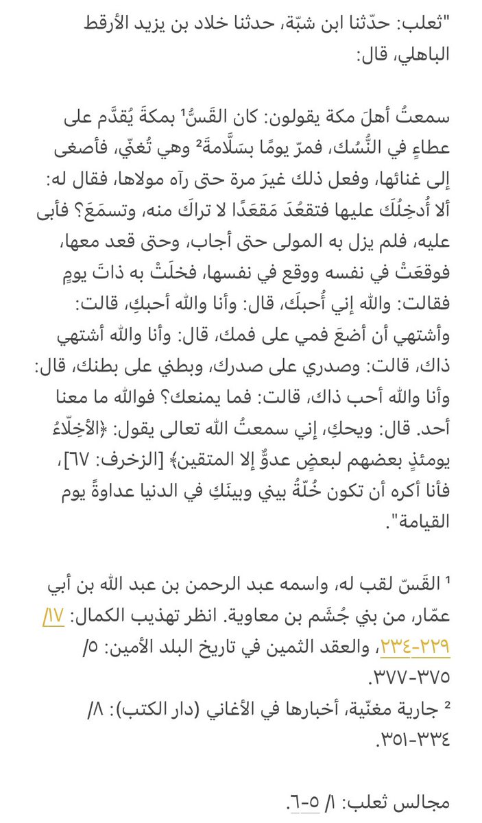 وقال أبو الحسن المدائني: هَوِيَ بعضُ المسلمين جاريةً بمكّة، فأرادها، فامتنعتْ عليه، فقال على لسان عطاء بن أبي رباح: