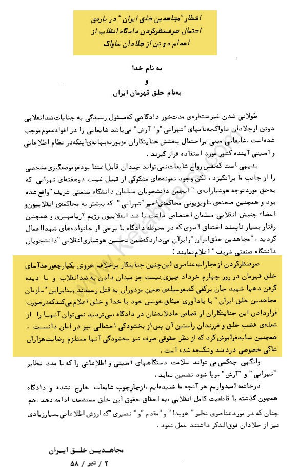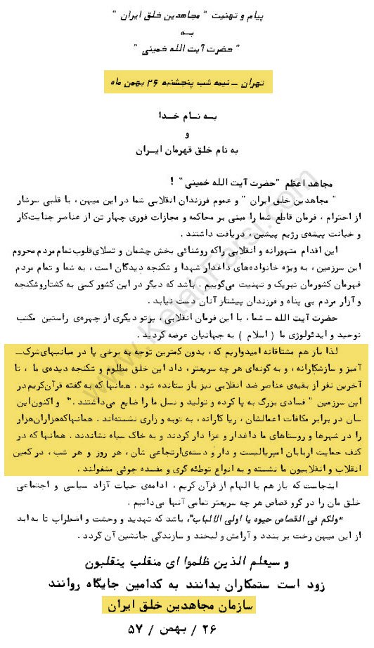 آیا میدانستید که مجاهدین 26 بهمن 57 دقیقا چند روز بعد از #شورش57 با منتشر کردن نامه ای از خمینی بابت فرمان اعدام 4 تن از فرماندهان ساواک تقدیر کردند و تو نامه نوشته اند که باید تک تک مرتبطین با حکومت سابق شناسایی و محاکمه(اعدام) شوند!