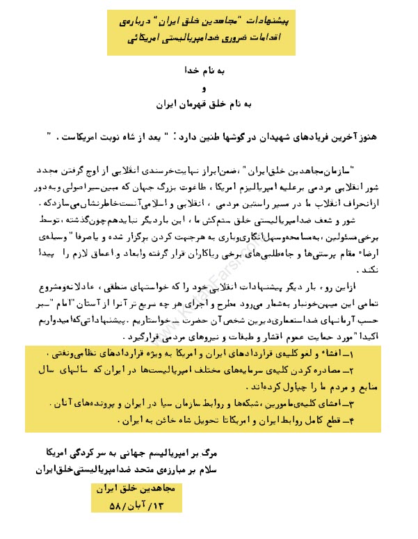 مجاهدین 13 آبان 58 بیانیه صادر می کنند و به خمینی و رژیم میگن ما باید با آمریکا بجنگیم باید هر چی قرارداد مشترک داریم رو کنسل کنیم و.....