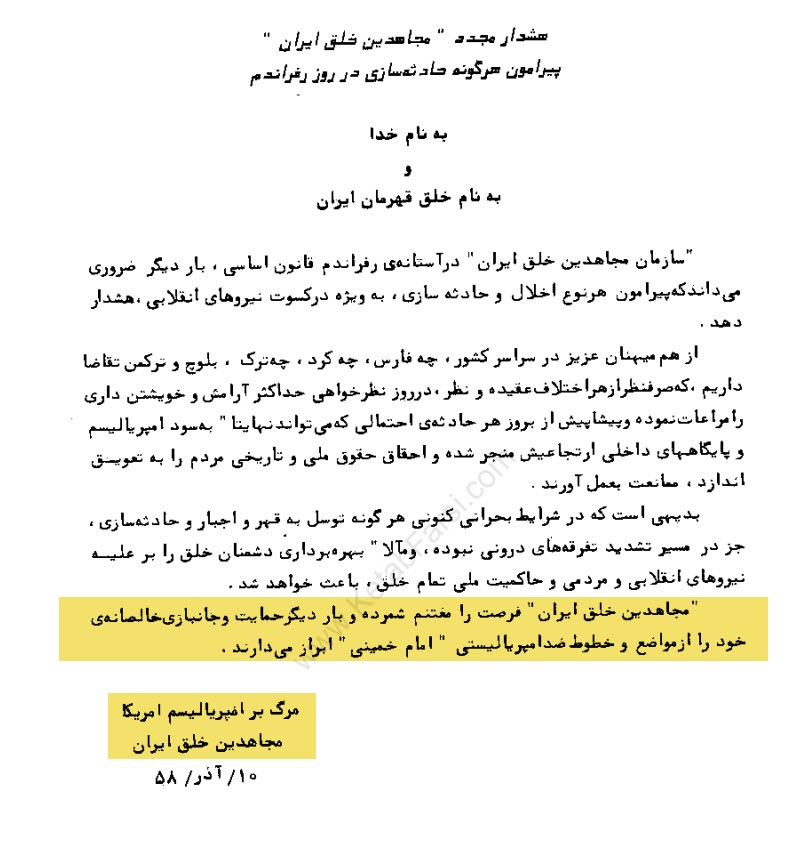 میدونستید مجاهدین 10 آذر 58 بیانیه صادر کردند و حمایت خودشون از قانون اساسی جمهوری اسلامی و مواضع ضد امپریالیستی خمینی را اعلام کردند؟؟