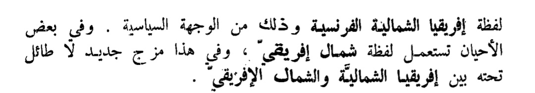 ▪︎ثم يتكلم عن وصفها بفتره بشمال إفريقيا الفرنسية لانها كانت تحت الاستعمار الفرنسي""و كثيرا ما تجري على الألسن لفظة إفريقيا الشمالية الفرنسية وذلك من الوجهة #السياسية . وفي بعض الأحيان تستعمل لفظة شمال إفريقي ، وفي هذا مزج جديد لا طائل تحته بين إفريقيا الشمالية والشمال الإفريقي"" .