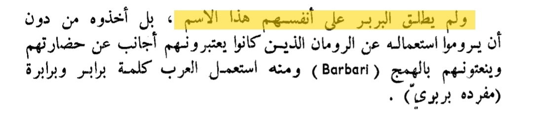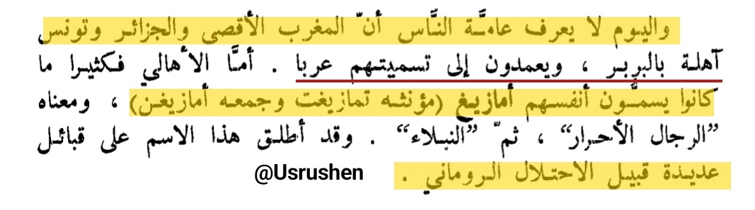 ▪︎و الضربة القاضية لأصحاب و اكذوبة الاكاديمية البربرية و فرية الصهيونية فيقول :"" واليوم لا يعرف عامة الناس أن المغرب الأقصى والجزائر وتونس آهلة بالبربر ، ويعمدون إلى تسميتهم #عربا . أما الأهالي فكثيرا ما كانوا يسمون أنفسهم #أمازيغ مؤنثه #تمازيغت وجمعه #إمازيغن ، ومعناه الرجال (الأحرار - النبلاء" ، وقد أطلق هذا الاسم على قبائل عديدة قبيل الاحتلال #الروماني""!! .