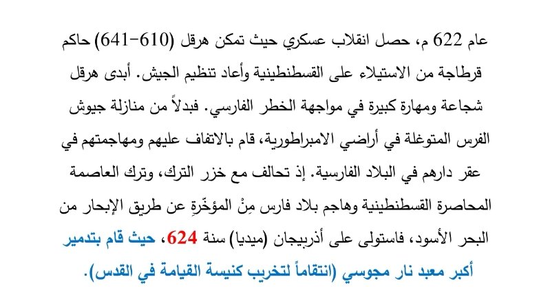 واضطرت لعقد معاهدات صلح مع الروم للحفاظ على بقية أراضيها.. فإذن من عام 614 إلى عام 624، هناك تقريبا أقل من 10 سنوات بقليل، حيث كانت خسارة الروم أواخر عام 614، وأوائل 624 عاد الروم وانتصروا على الفرس.